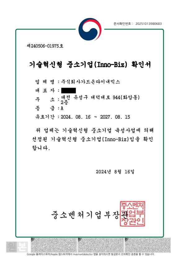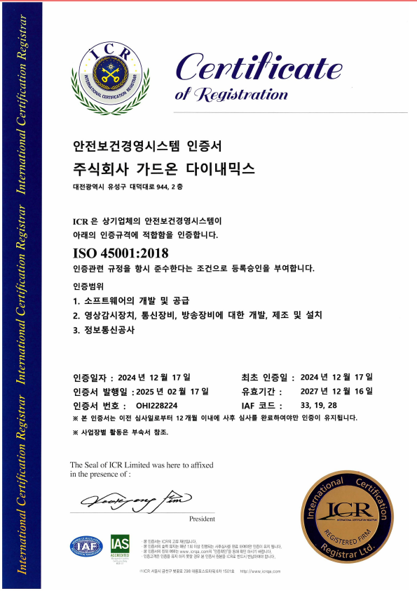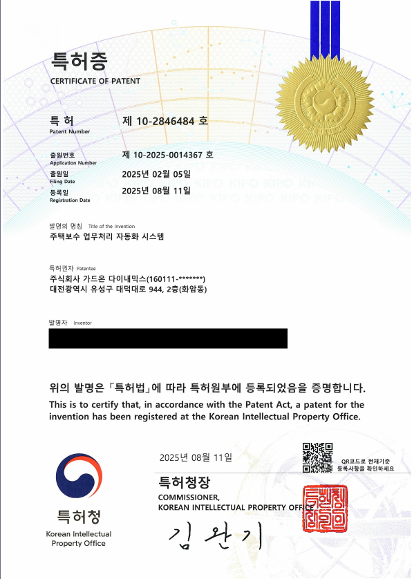GS(1등급) 인증 및 주요 인증 및 특허 작성자 ADM 작성일 25-10-01 06:46 첨부파일 GS인증서.png (289.5K) GS현수막 전경.jpg (340.0K) 이노비즈인증서.png (127.9K) 안전보건경영인증서.png (290.0K) 특허유지보수자동화.png (407.4K) 본문 10여개의 핵심 인증과 20여개의 특허를 보유하고 있고 오늘도 연구개발은 계속되고 있습니다. 목록 이전글5월 가정의달 행사 25-05-10 다음글황정아 의원(국가과학기술특위 위원장) 당사 방문 25-09-10
